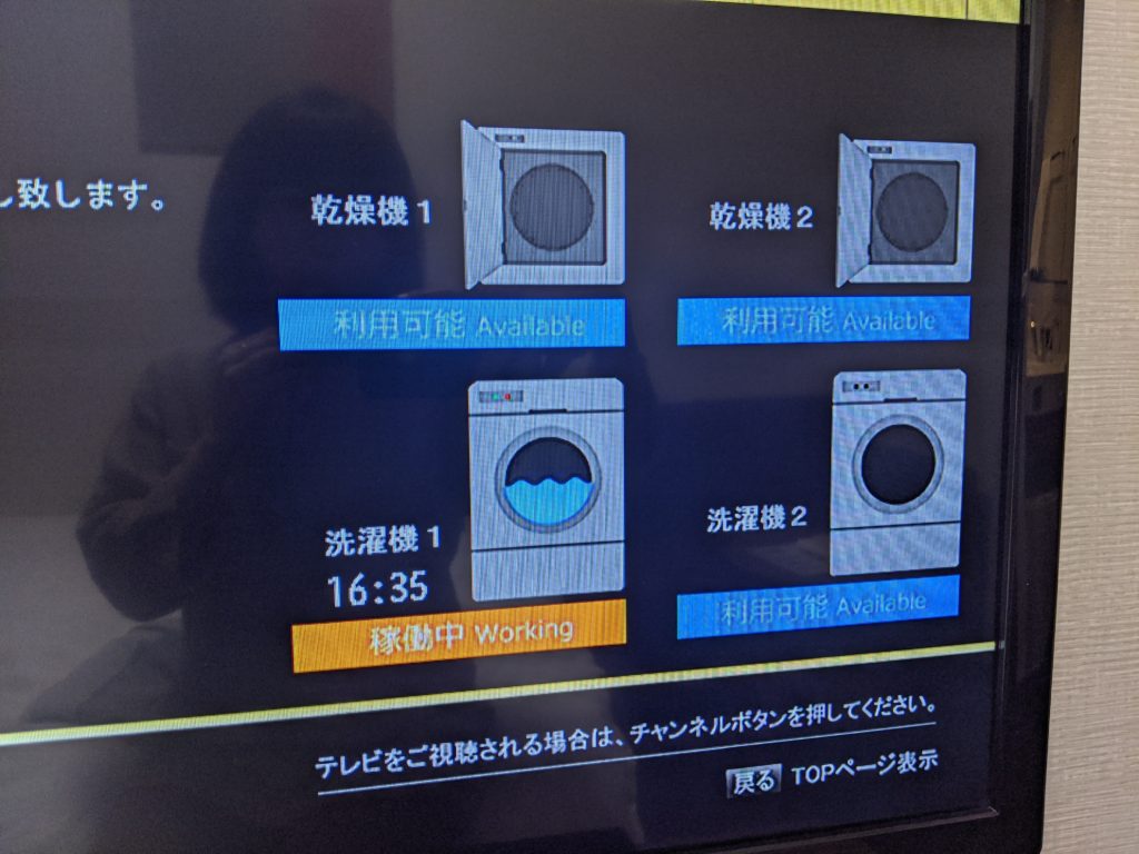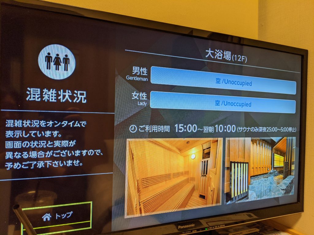 - 部屋のテレビからお風呂や朝食会場の混雑具合がわかる。洗濯機の利用状況がわかるところも。